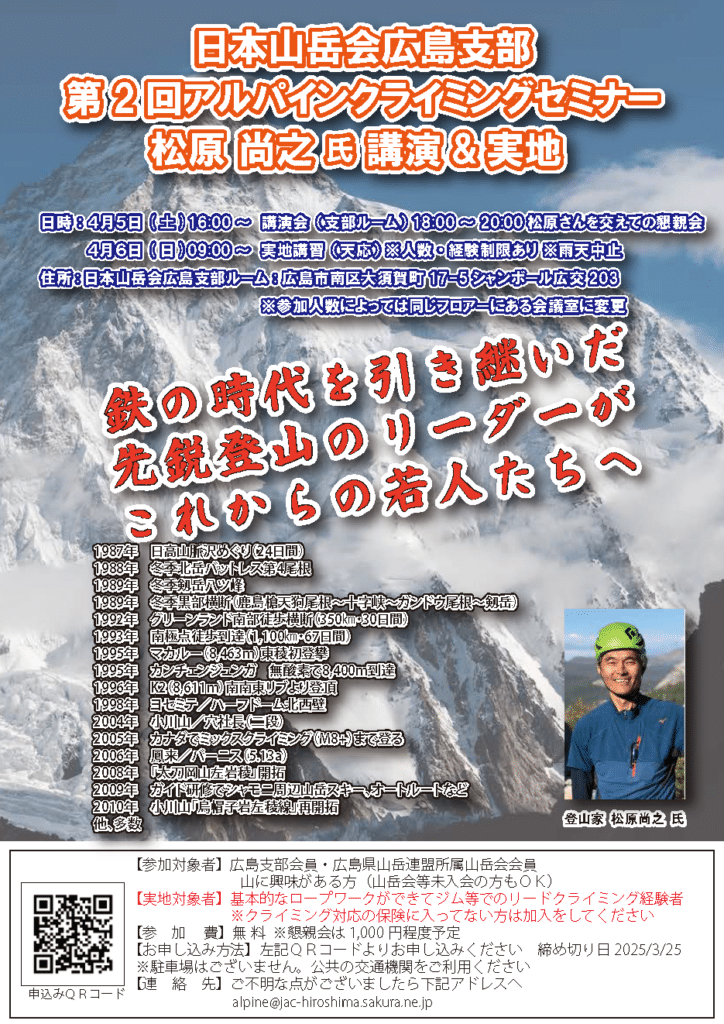 日本山岳会広島支部 第2回アルパインクライミングセミナー 松原尚之氏 講演&実地