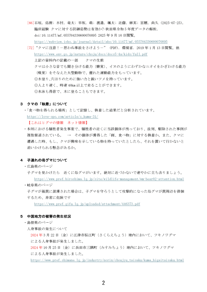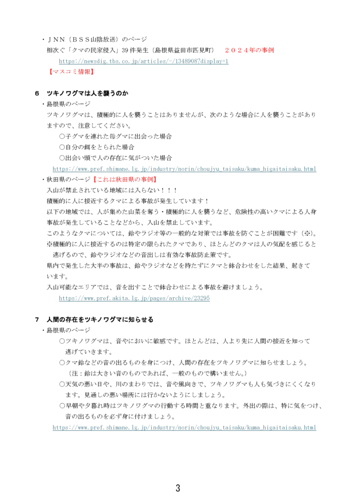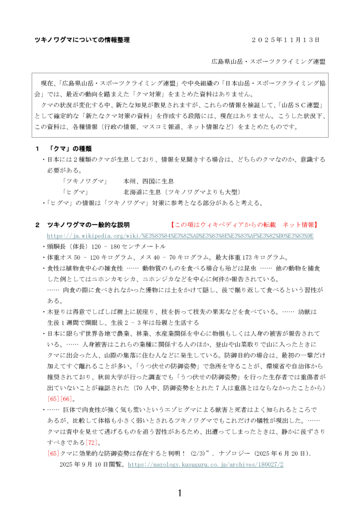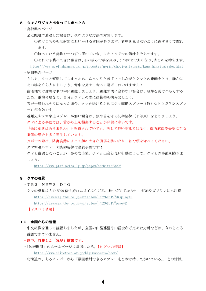 この資料は、組織内の会員向けに作成したものですが、昨今のクマの急激な行動変化を受け、一般の皆様にも参考にしていただきたく、ここに掲載するものです。